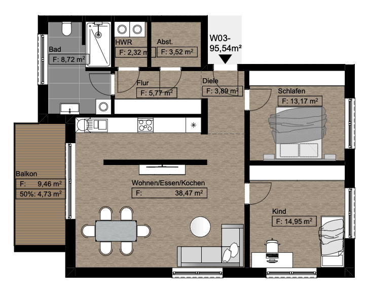Der großzügige Wohn- und Essbereich ist lichtdurchflutet und bietet durch die offene Küche ein einladendes, kommunikatives Zentrum der Wohnung. Große Fenster schaffen eine helle und freundliche Atmosphäre, während der Balkon direkt vom Wohnbereich aus zugänglich ist – ideal für Frühstück an der frischen Luft oder gemütliche Abende im Sommer.