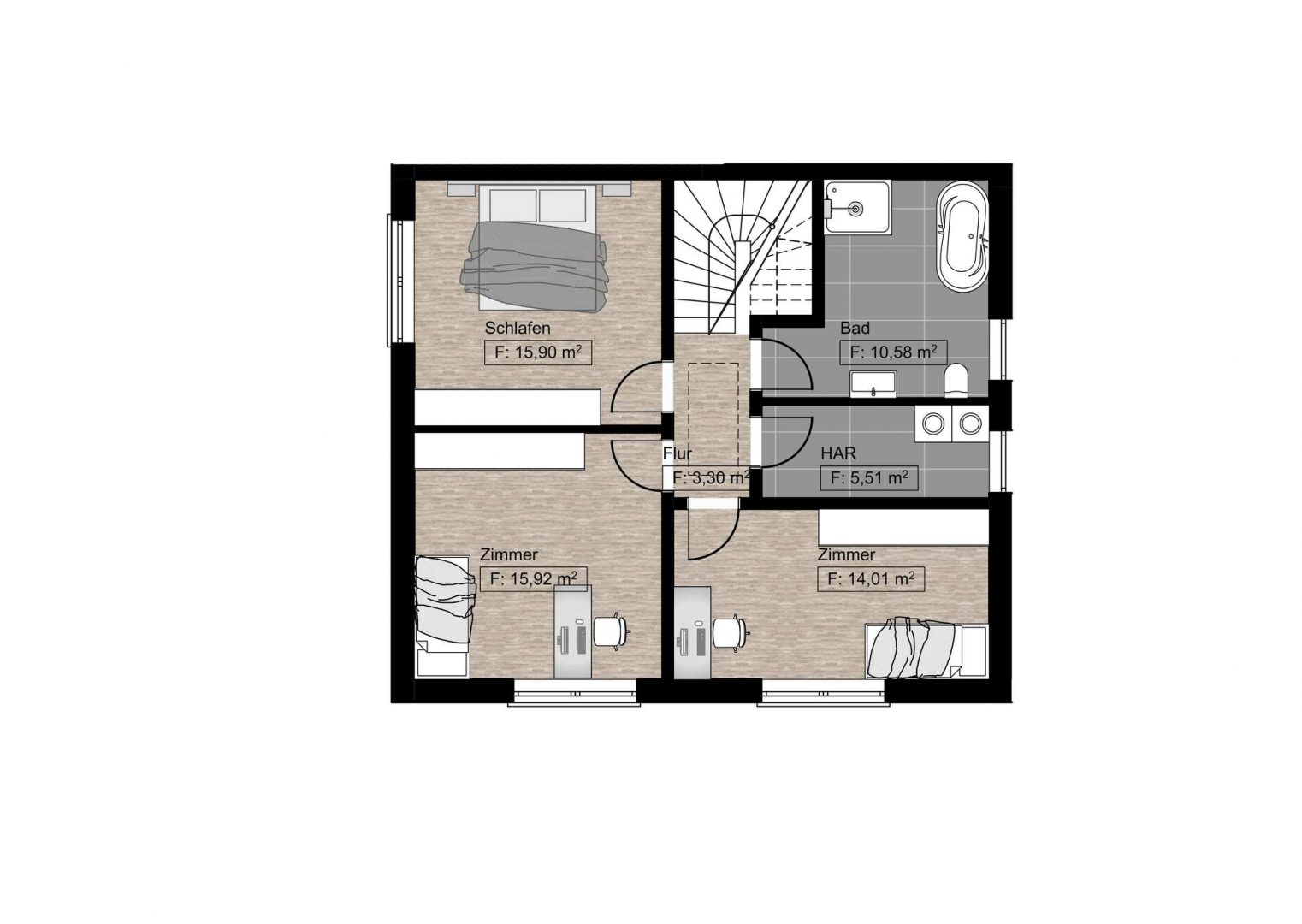 Im Obergeschoss befinden sich drei geräumige Schlafzimmer, die viel Platz für Ruhe und Privatsphäre bieten. Das Hauptschlafzimmer überzeugt mit einem großen Fenster und viel Tageslicht. Ein modernes Familienbad mit hochwertiger Ausstattung und eine zusätzliche Galerie, die als Arbeits- oder Spielbereich genutzt werden kann, machen das Obergeschoss komplett.