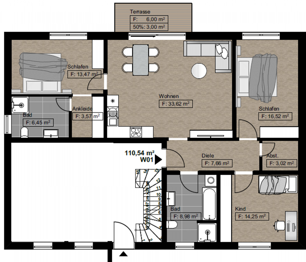 Der offene Wohn- und Essbereich schafft eine einladende Atmosphäre und bietet direkten Zugang zur Terrasse. Diese lädt dazu ein, die Natur zu genießen und den Tag entspannt im Freien ausklingen zu lassen.