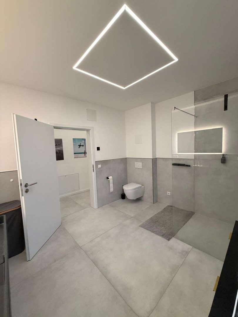 Das modern ausgestattete Badezimmer verfügt über alle notwendigen Einrichtungen und sorgt für ein angenehmes Wohlfühlambiente.