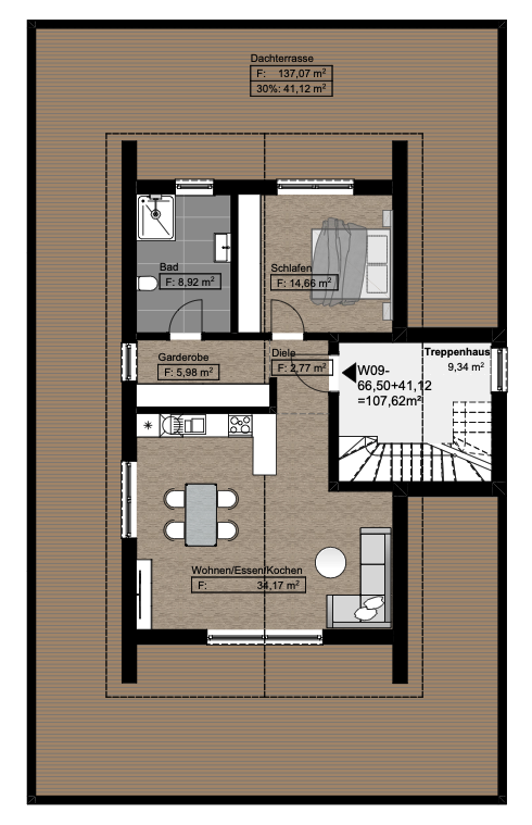 Das Highlight bildet eine sonnige Dachterrasse, die mit ihrer Größe zum Verweilen, Sonnenbaden oder zum stilvollen Empfang von Gästen einlädt. Hier genießen Sie einen traumhaften Ausblick und absolute Privatsphäre über den Dächern.
