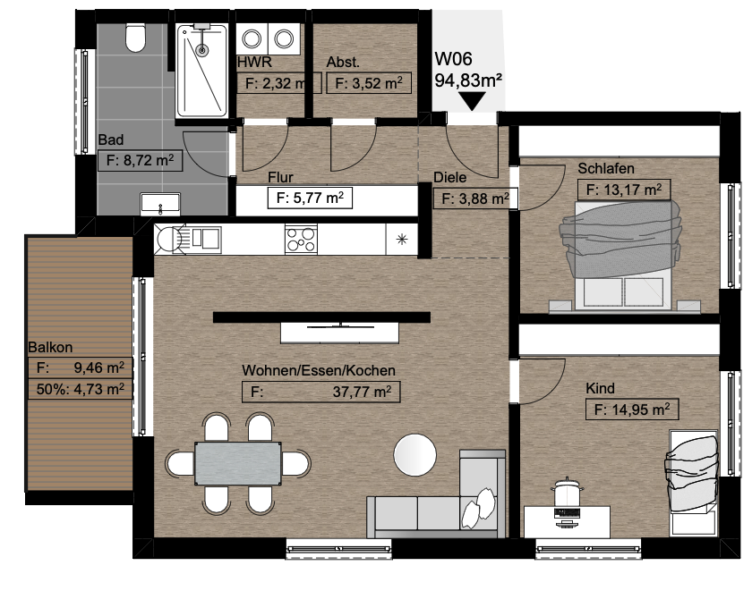 Der großzügige Wohn- und Essbereich ist lichtdurchflutet und bietet durch die offene Küche ein einladendes, kommunikatives Zentrum der Wohnung. Große Fenster schaffen eine helle und freundliche Atmosphäre, während der Balkon direkt vom Wohnbereich aus zugänglich ist – ideal für Frühstück an der frischen Luft oder gemütliche Abende im Sommer.